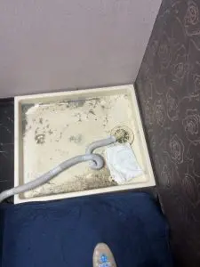 長年の洗濯機の振動と重さにパンの底が抜け落ちた現場でした。